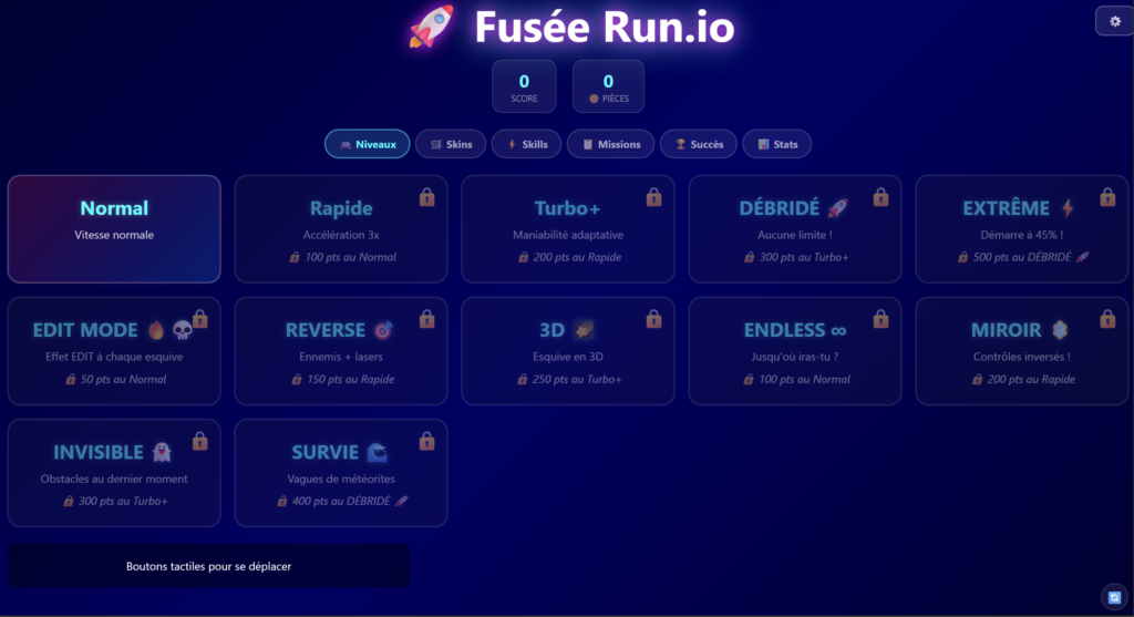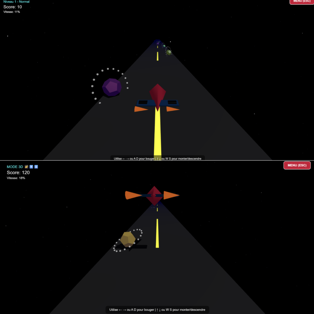 Un jeu d’esquive spatial en 3D (Three.js) oĂą tu pilotes un vaisseau sur une route dans l’espace pour Ă©viter des mĂ©tĂ©orites colorĂ©es. Le jeu accĂ©lère progressivement jusqu’Ă ce que tu crashes. ContrĂ´les clavier uniquement (flèches/WASD), meilleurs scores sauvegardĂ©s par niveau, ambiance spatiale avec Ă©toiles, brouillard et Ă©clairages nĂ©on magenta/cyan.